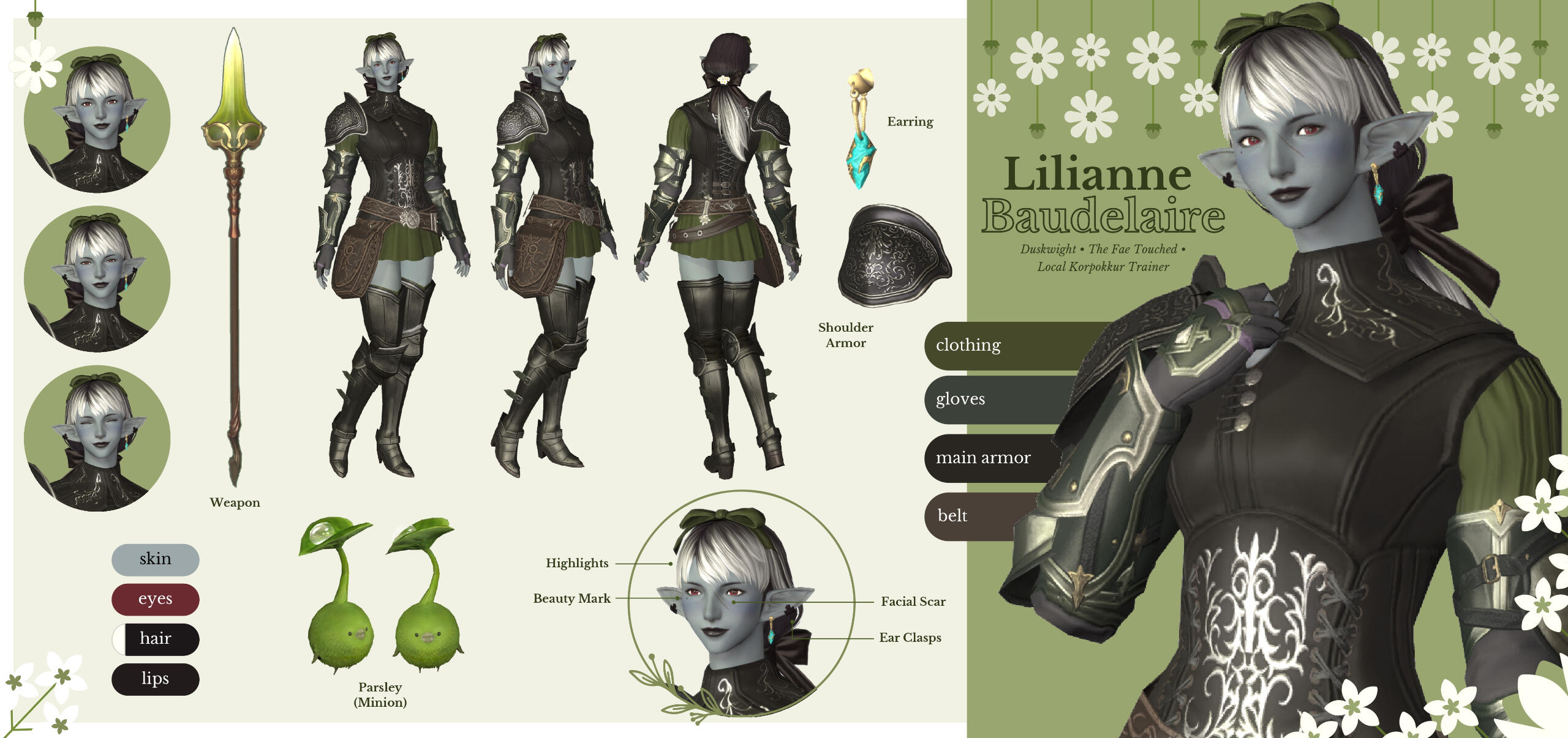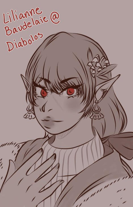 Slowly breaking out of her shell, Lilianne became intrigued with the art of the Dragoons and Knights she would observe in passing, and later on befriend in a young Haurchefant Greystone. The two would become siblings in all but blood, and would be one of Lilianne’s main inspirations for learning and pursuing Dragoon techniques throughout her teenage years.Just around her 21st Nameday, Lilianne would be met with matters finally coming to a head for her families business funds falling short from a decline in traveling adventurers caused by the neighboring Dragonsong War nearing closer to her home. Hesitantly taking matters into her own hands in order to support her parents, Lilianne set forth to venture to Gridania to focus her efforts there to sell her botanist wares and practices, and unknowingly delve forth into the world of adventuring.